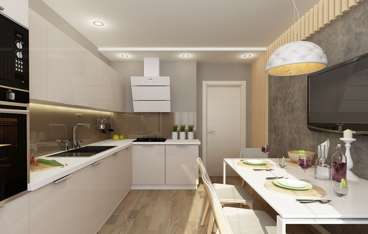 Прямоугольная форма комнаты накладывает больше ограничений на дизайн кухни 10 кв. метров в современном стиле. Варианты планировки: