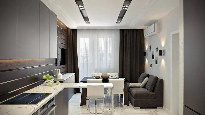 Кухня с диваном предполагает, что в данном случае рабочая зона полуостровом выносится в центр помещения. Подойдет и вариант с барной стойкой.