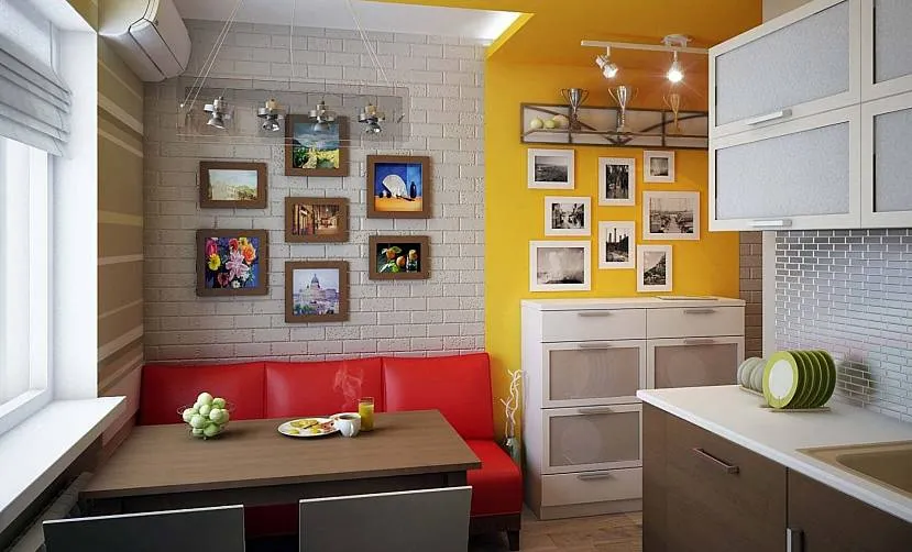 Небольшой прямой диван в интерьере 11-метровой кухни