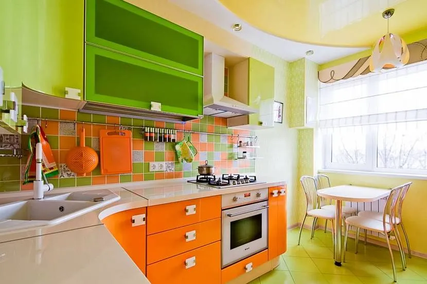 Лучший компаньон для оранжевого цвета в интерьере комнаты. Комбинируют как нежные тона, так и яркую (кислотную) гамму. Дизайнеры рекомендуют выбрать 4 оттенка из обеих палитр, украсить кухню от потолка и стен до текстиля на мебели. Доминирующим выбирают один тон, а остальные слегка приглушают. К примеру, для фона можно использовать зеленые обои.