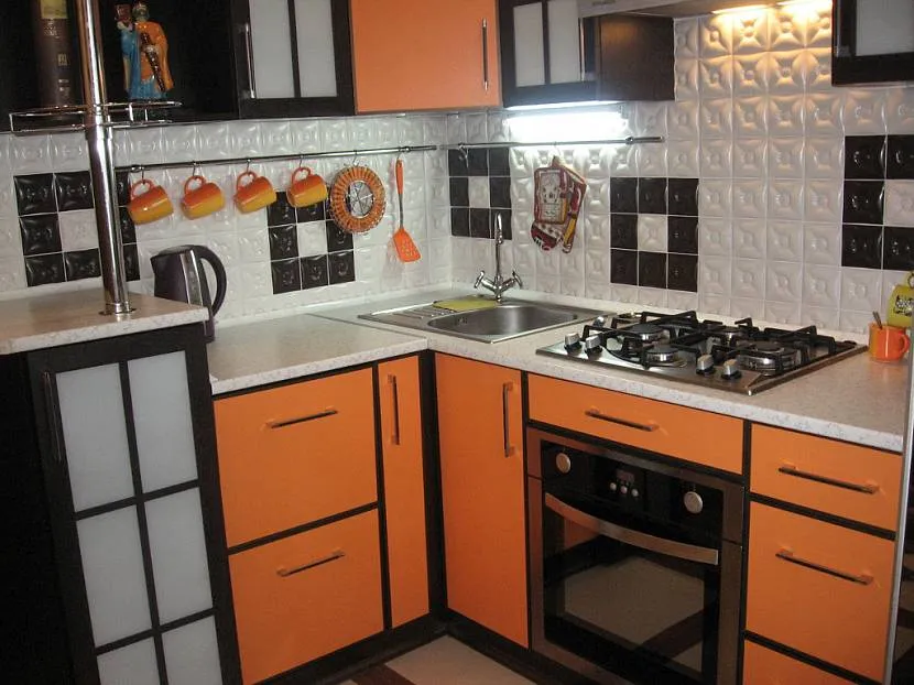 Помимо фартука, в композиции гарнитура и всей рабочей зоны участвует и столешница. Ее цвет и фактура влияют на общее впечатление и настроение интерьера. Стандартно черно-оранжевый дизайн дополняют угольной столешницей. Но есть и другие гармоничные варианты: