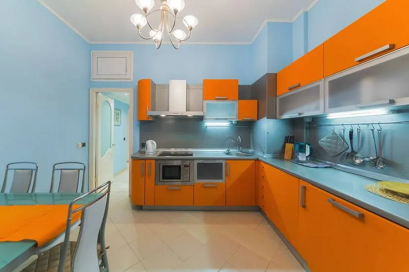 Теплый тон можно сочетать с освежающим вариантом из синей гаммы. Нежно-голубой верх и тыквенный низ помогают визуально увеличить пространство маленького помещения. В интерьере гармонично смотрится шахматка из оттенка морской волны и персиковый в оформлении фона. Темно-лазурный комбинируют с сочным апельсиновым, а приглушенный морковный – с бирюзой. В дуэте оранжевый приобретает более насыщенное звучание. Противопоказано совмещение с фиолетовым.