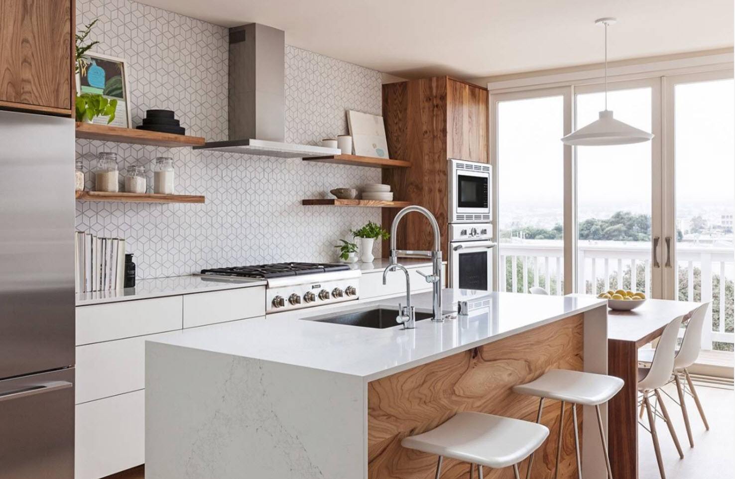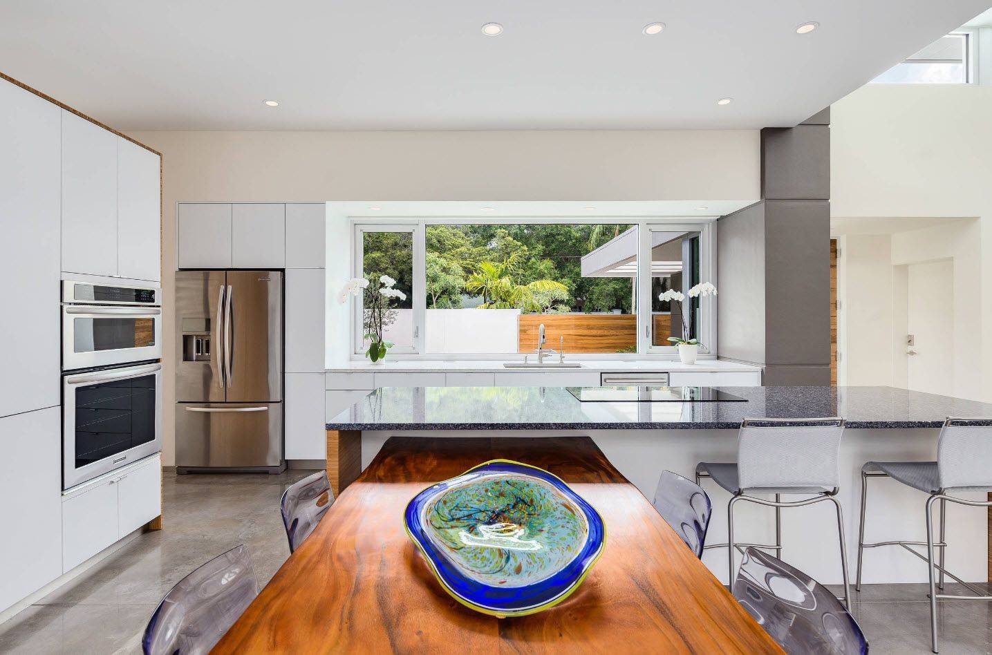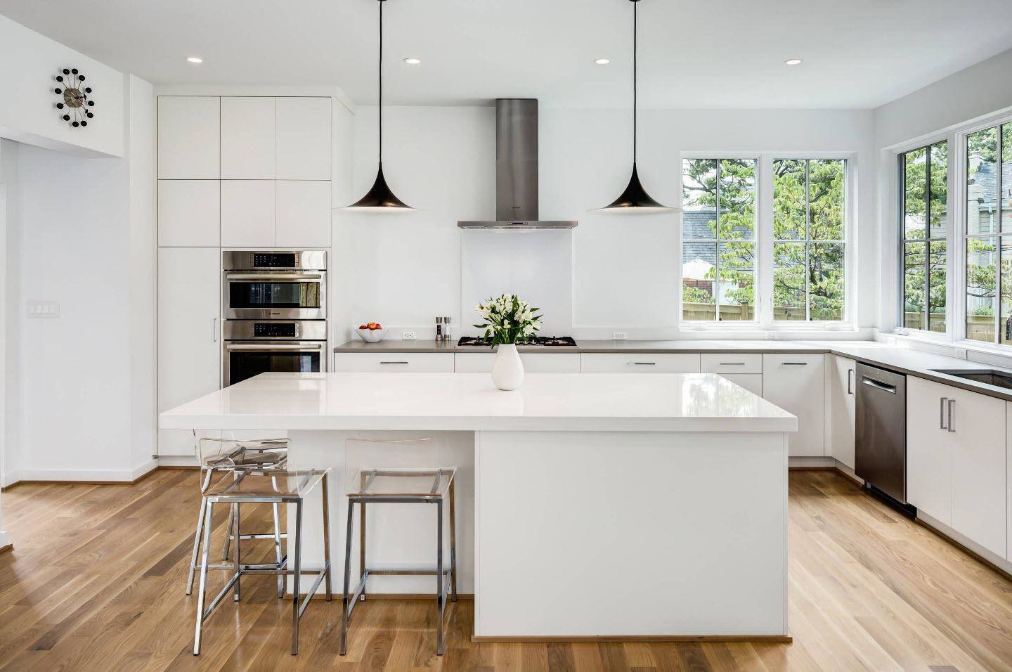 На кухнях часто не хватает окон, поэтому современные дизайнеры предпочитают обустройство комнаты в белом цвете с добавлением деревянных элементов. Следуя последним тенденциям, вы также можете попробовать вкрапление графита или антрацита.