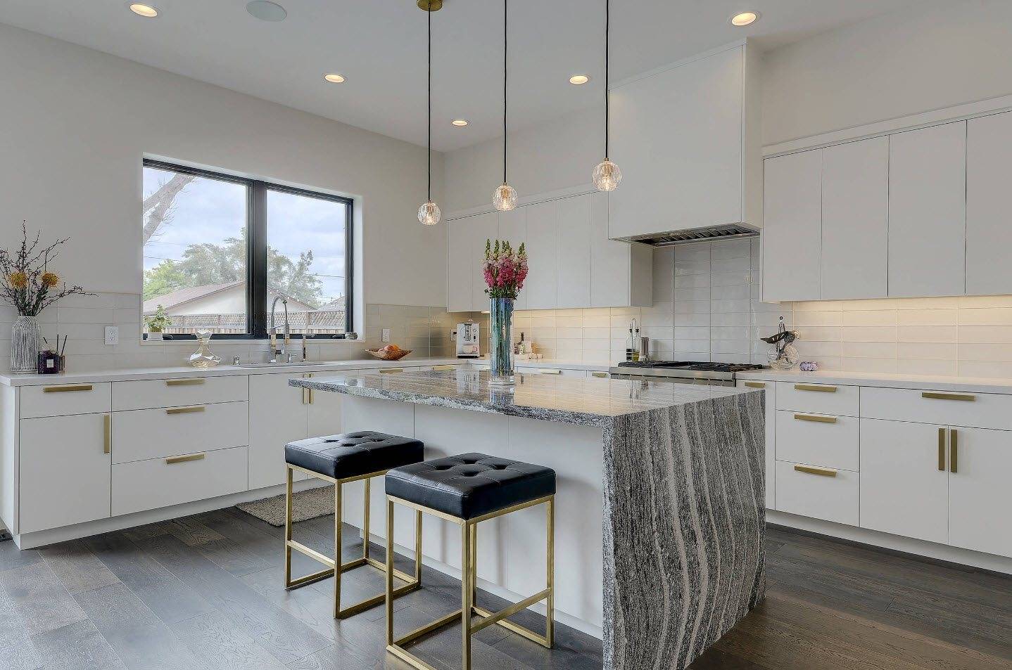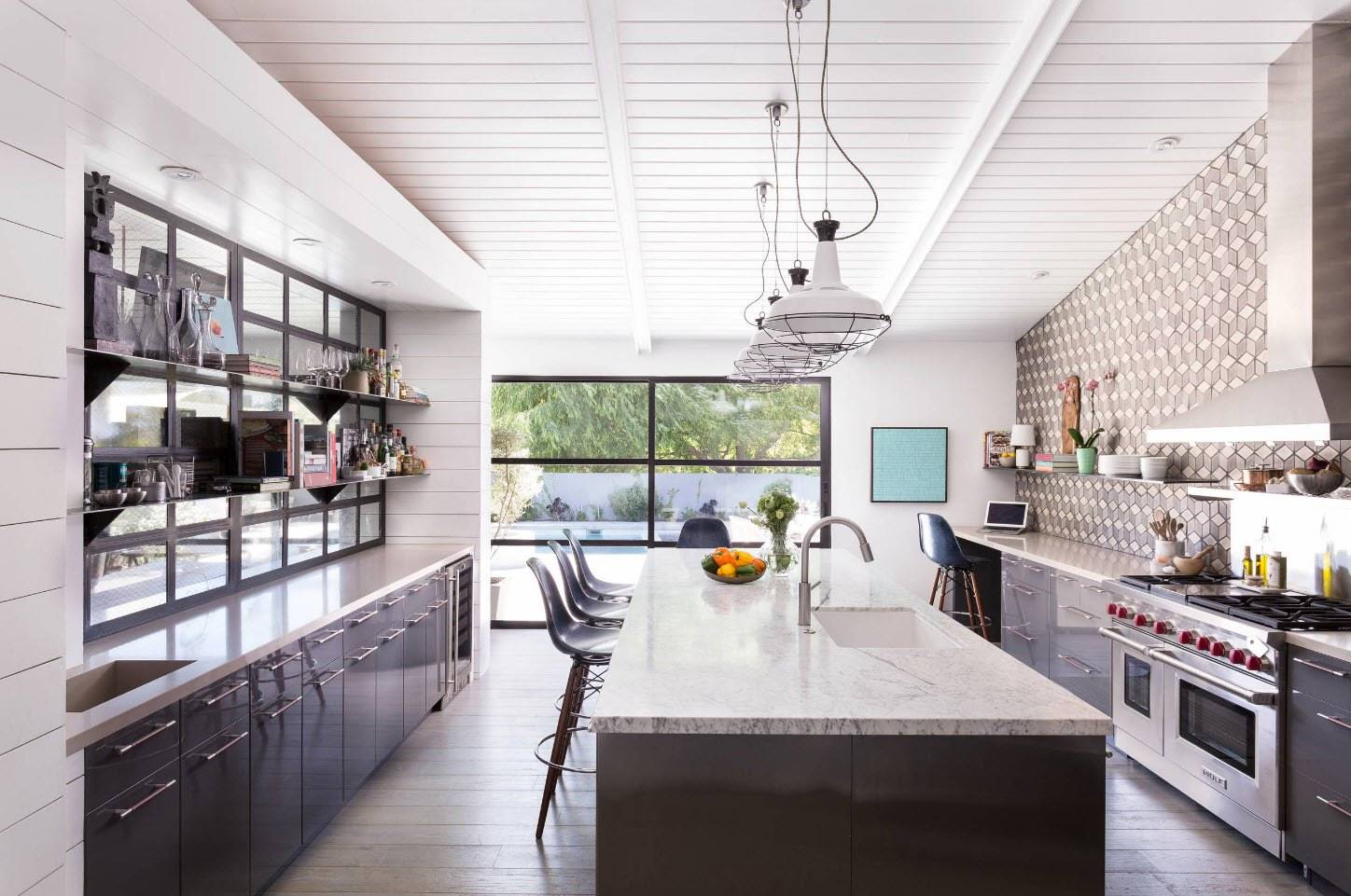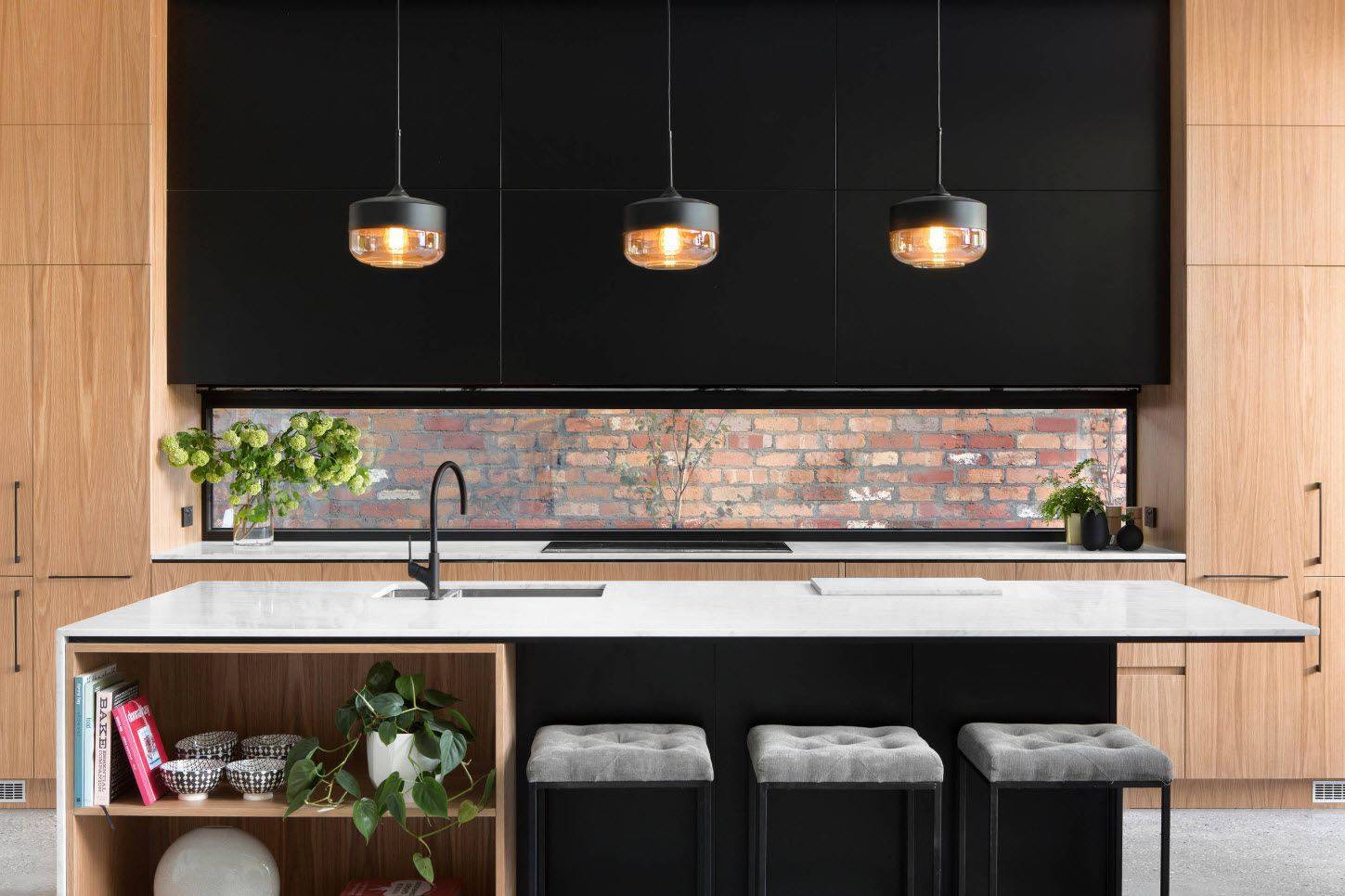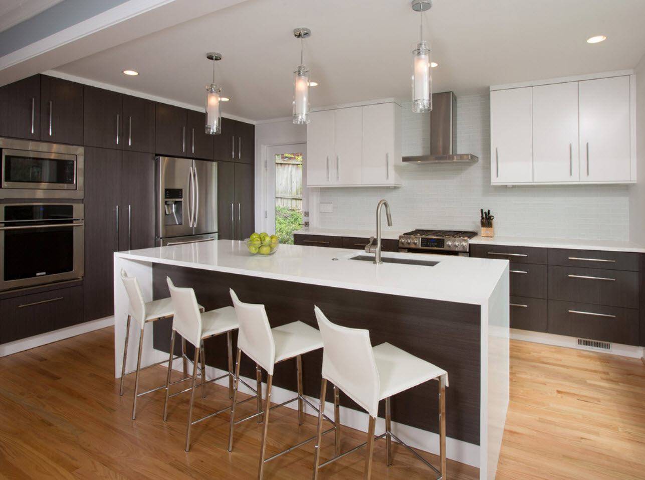 На кухнях часто не хватает окон, поэтому современные дизайнеры предпочитают обустройство комнаты в белом цвете с добавлением деревянных элементов. Следуя последним тенденциям, вы также можете попробовать вкрапление графита или антрацита.