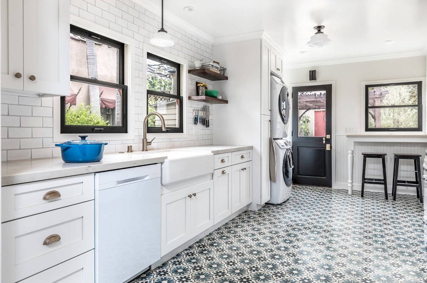 Разнообразие видов напольных покрытий позволяет выбрать гармонично сочетающиеся, но в то же время разные покрытия для кухни и гостиной. Красиво, стильно выглядит, например, плитка в кухонной части и ламинат в гостиной. Многочисленные фото, представленные далее, убедят в этом.