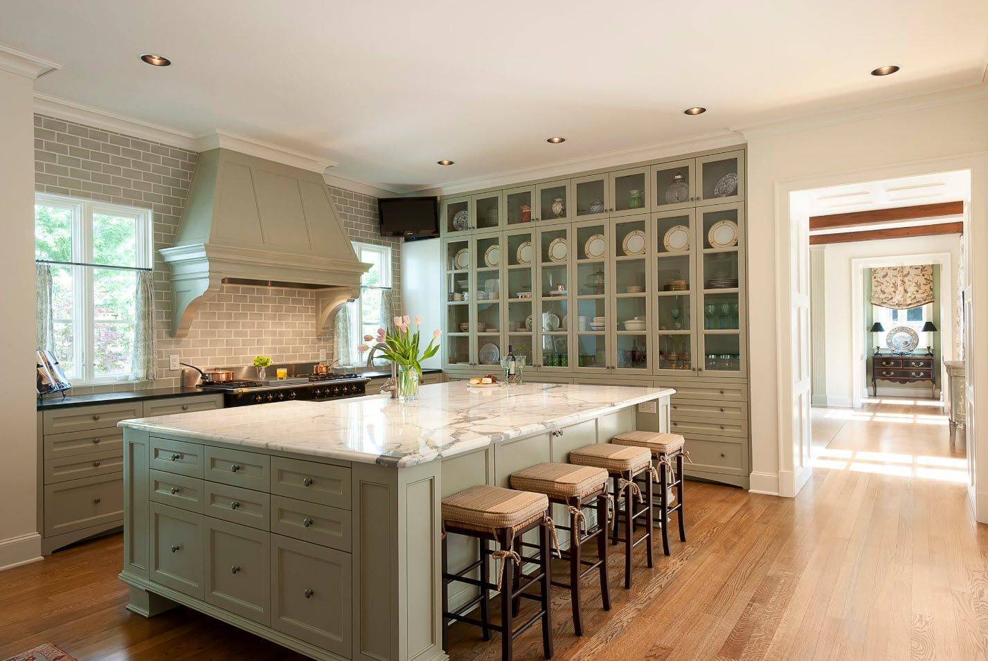 Наличие мебели с ажурными фасадами, вычурной фурнитурой, украшенной резьбой или стеклянными и зеркальными вставками позволяет выбрать один из классических стилей кухни.