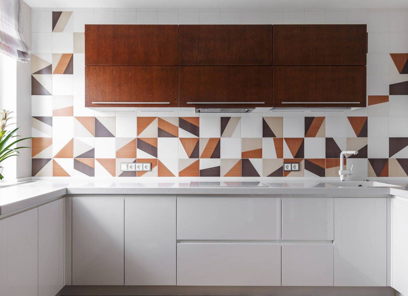 - Фартук кухни следует выкладывать плиткой в светлых тонах.
