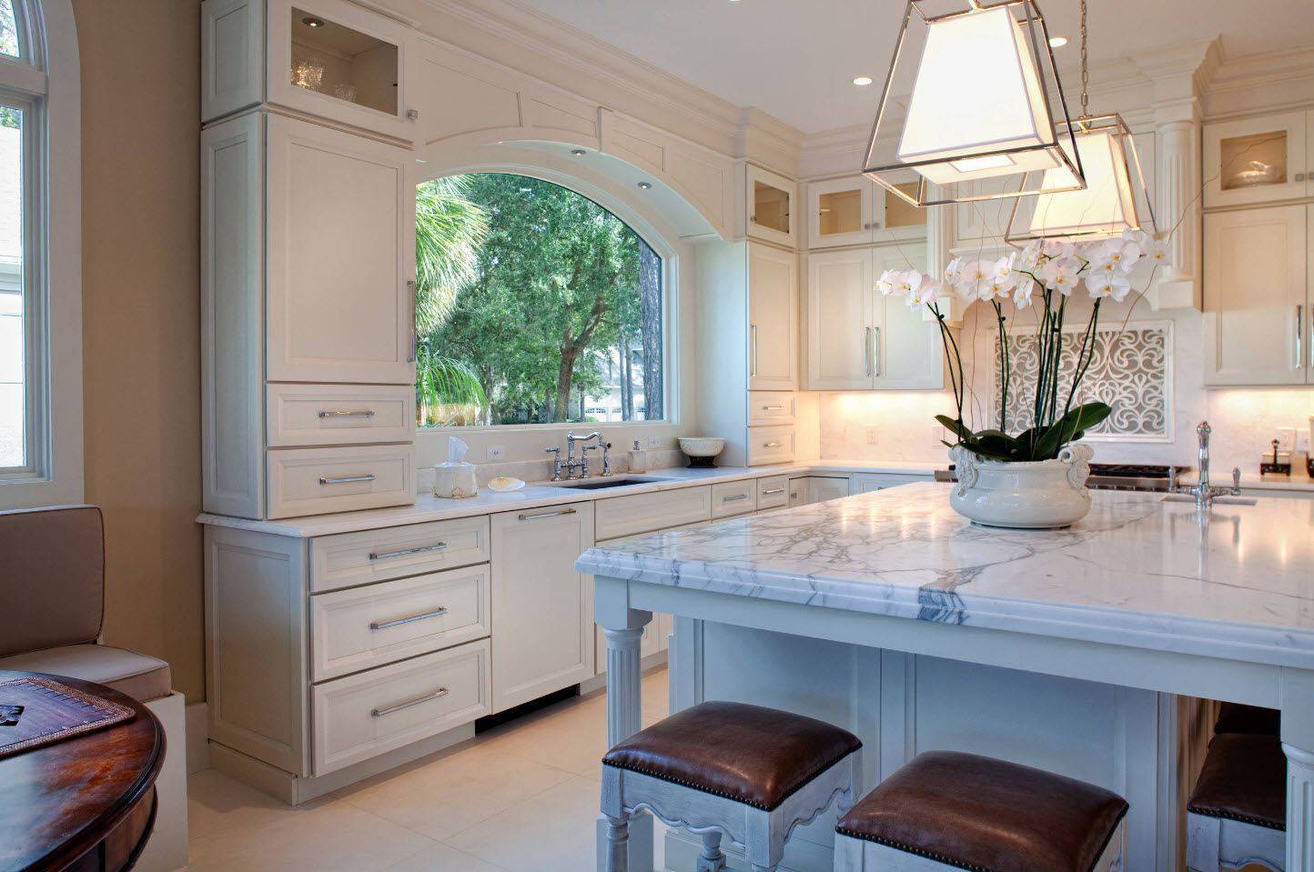 Устройство в помещении островной кухонной зоны очень модное и необычное решение, которое смотрится невероятно красиво. Мебель, расставленная в форме острова, дает доступ к себе с любой стороны, это очень удобно при готовке блюд.