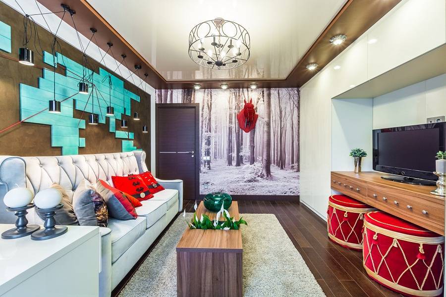 Оформление гостиной в современном стиле подразумевает использование и контрастных оттенков. К примеру, одну стену можно покрасить в яркий цвет, а остальные сделать в светлых тонах.