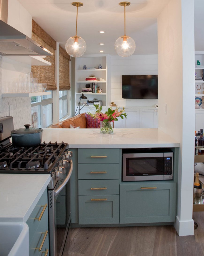 Микроволновая печь присутствует на каждой кухне, в условиях маленькой площади ее габариты будут существенно сковывать движения хозяйки. Рекомендуется рассмотреть вариант встроенной печи.