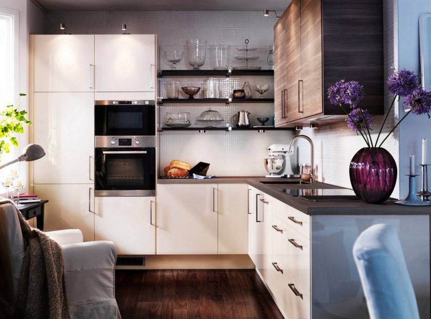 Для рационального использования пространства можно отказаться от навесных шкафов и заменить их лёгкими открытыми полками. На полках можно хранить аккуратные баночки с крупами и приправами, мелкую бытовую технику (кофемолку, миксер, электрочайник и т.п.). Не стоит забывать, что в отличие от закрытых шкафов, содержимое полок на виду у всех гостей, поэтому их стоит часто протирать от пыли и заполнять лишь красивой посудой из фарфора, хрусталя, цветного стекла.