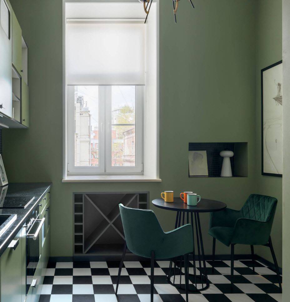 В таком случае кухню отделывают такими оттенками, от созерцания которых органы зрения не будут ощущать усталости. Например, таковыми могут служить белый и светло-зеленый тона. Глянец на поверхности стен хорошо отражает свет, что тоже надо взять на заметку.