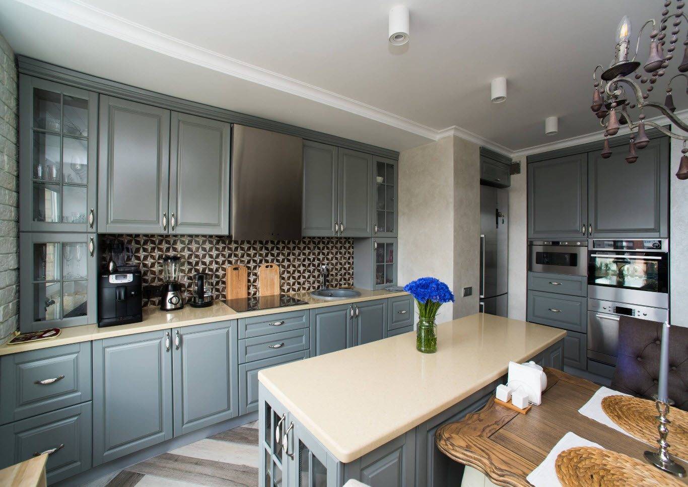 Достаточная консервативность цвета не делает его менее популярным решением для кухни. Дизайнеры рекомендуют сочетать серый с желтыми или белыми оттенками. Причем серый может использоваться в качестве отделки или как основной для текстиля, мебели. Подходит для реализации классического и современного стилей.