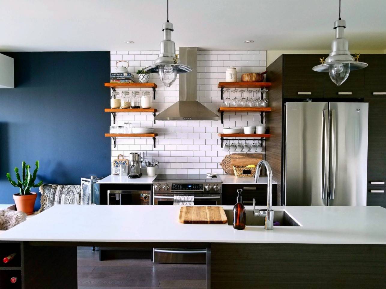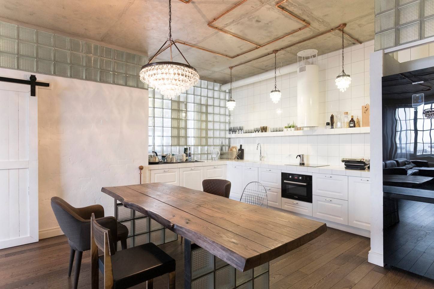 Отказ от верхних шкафов можно считать и демонстрацией несогласия с привычными шаблонами, и смелой заявкой на расширение границ. Эта идея как нельзя лучше вписывается в философию стиля лофт, делающего ставку на максимум свободного пространства и суровые промышленные мотивы в интерьере.