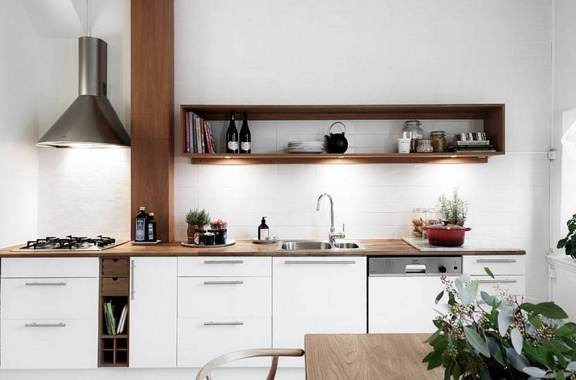 - При классическом варианте планировки кухни вытяжку прячут в верхние навесные шкафы. Что делать, если от верхнего яруса гарнитура решено было отказаться? Есть несколько способов установки вытяжки на такой кухне.