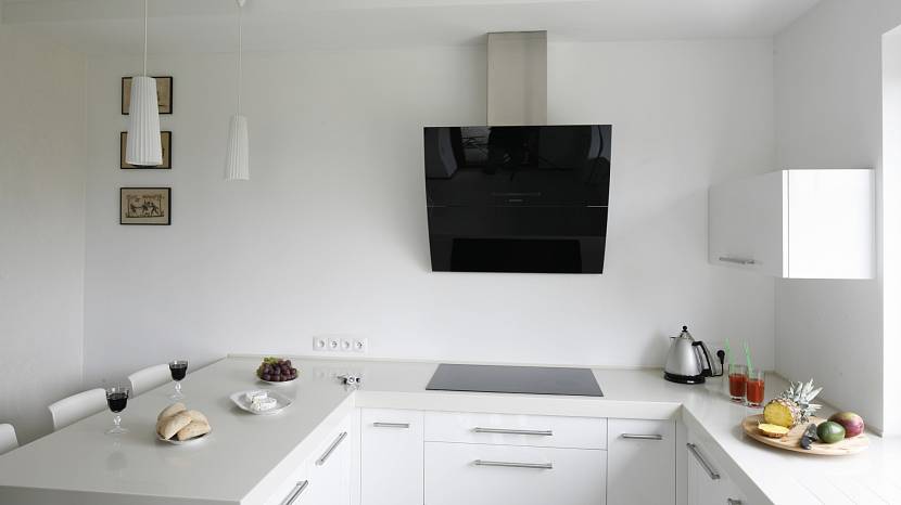 Шикарно будет смотреться вытяжка на кухне на белом оттенке стены. Такой вариант интерьера допустим, так как всю белоснежность разнообразит оборудование. Вытяжной зонт может быть объемным, с обтекаемыми или четкими геометрическими формами.