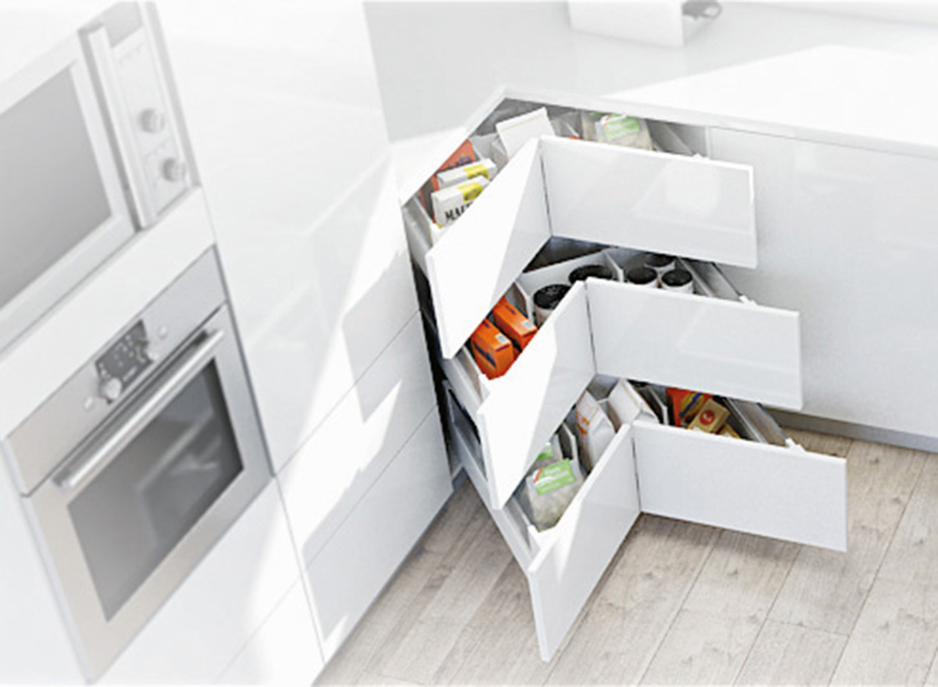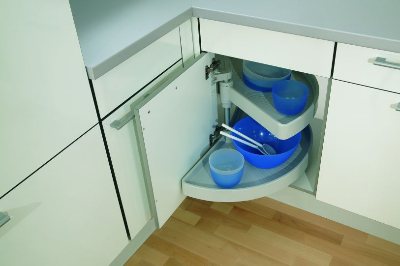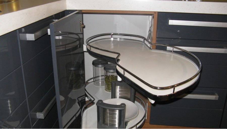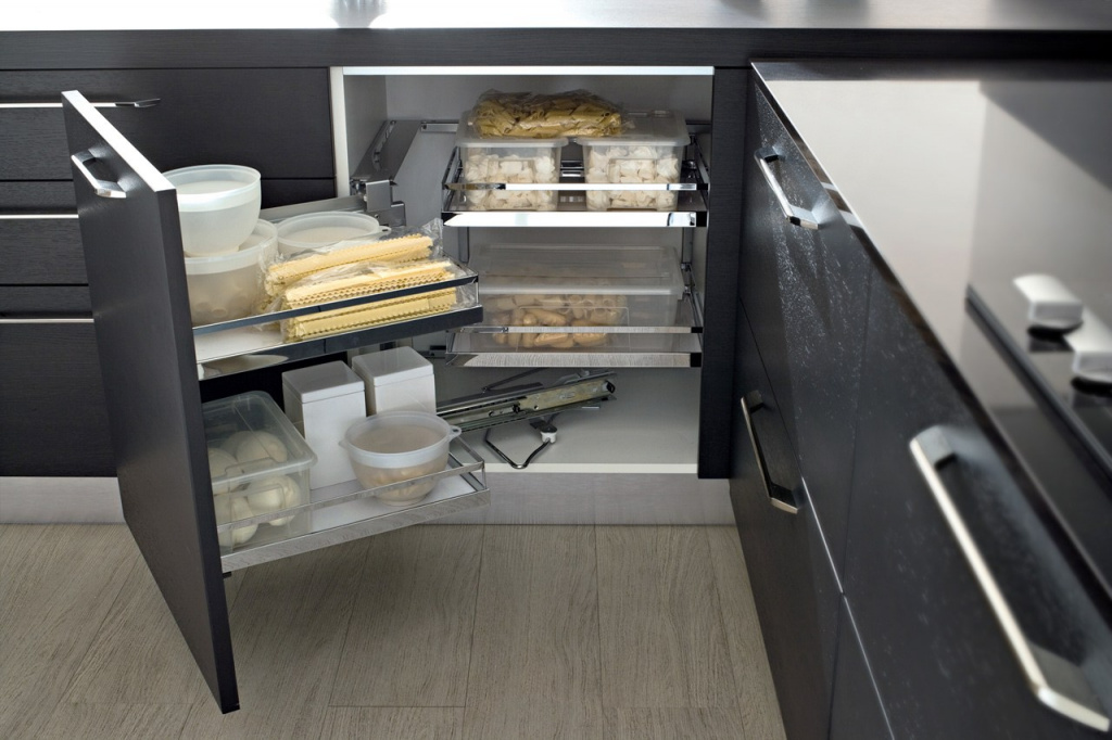 Некоторые считают, что без выдвижных и вращающихся полок в шкафу поместится больше посуды и продуктов. В этом есть доля правды, но мало кто хочет дотянуться до кухонной утвари в дальнем углу шкафа, прежде чем вытащить оттуда половину вещей. Фурнитура сделает работу с гарнитурой проще и удобнее, а также повысит ее функциональность.