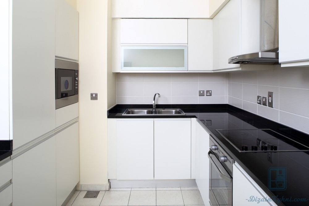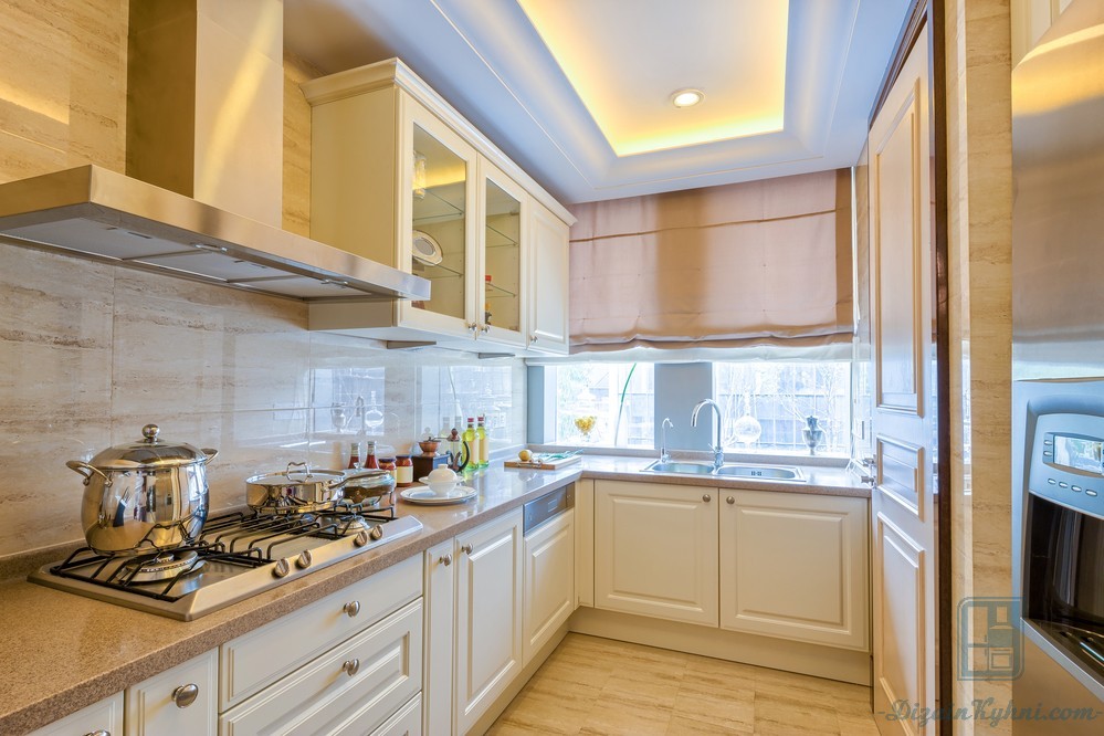 Другим решением, считается натяжной потолок, он не только зрительно увеличит пространство, но и позволит спрятать дополнительную вентиляцию, без которой страдает кухня без окна в квартире.