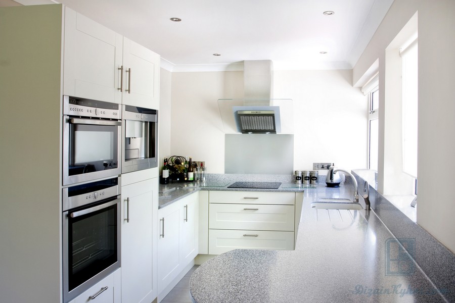 Вытяжка в современном или классическом стиле, если ее разместить по центру, украсит интерьер П-образной кухни.