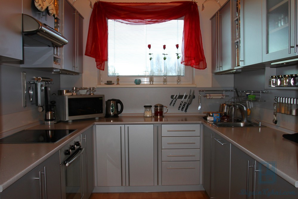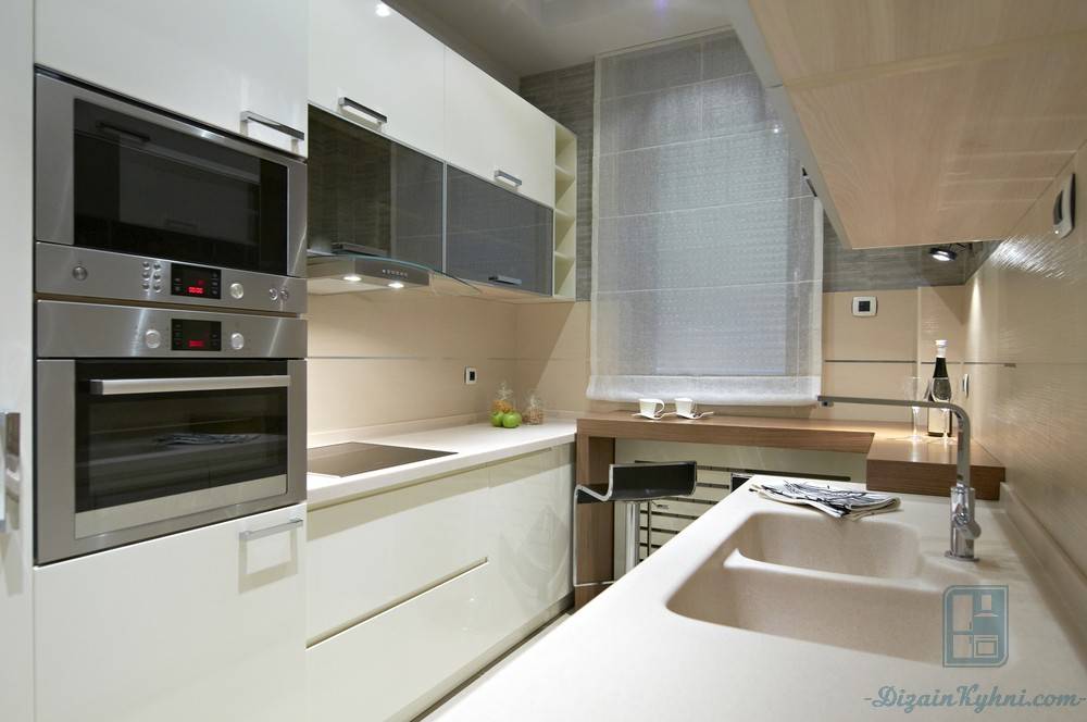 П-образный гарнитур в маленькой квартире подойдет тем, кто хочет максимально использовать площадь. Такая планировка позволяет организовать большой склад, большую рабочую зону и обеспечить всем необходимым оборудованием. Стол в виде части гарнитура (на подоконнике / как барная стойка) сэкономит место, если его невозможно перенести в другую комнату.
