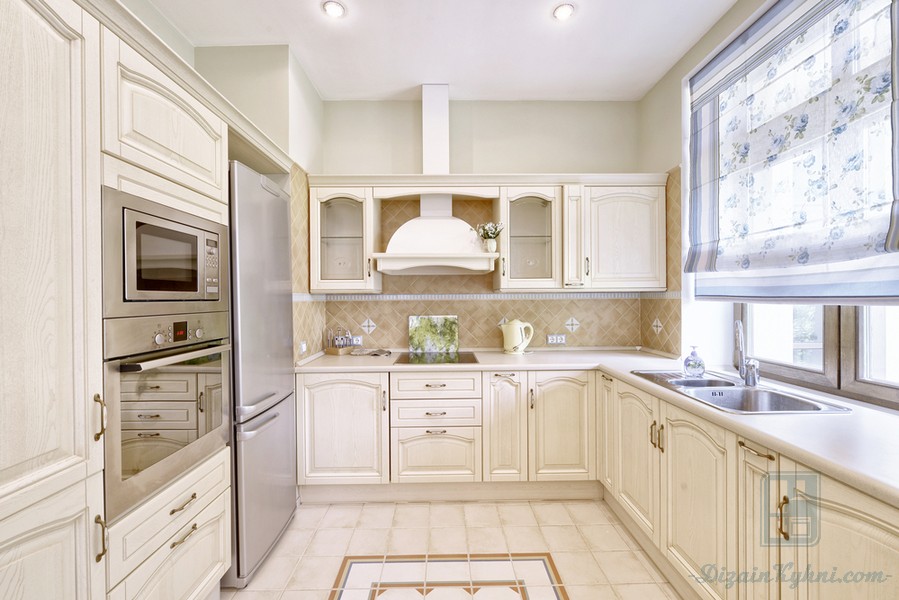 Интерьер кухни в частном доме с двумя окнами на разных стенахДизайн кухни с большими окнами на разных стенах для типичной современной семьи, может быть выполнен в духе романтичного классицизма. Примечательная деталь такого интерьера: тяжелые портьеры, которые редко встретишь на кухнях 2017 года.