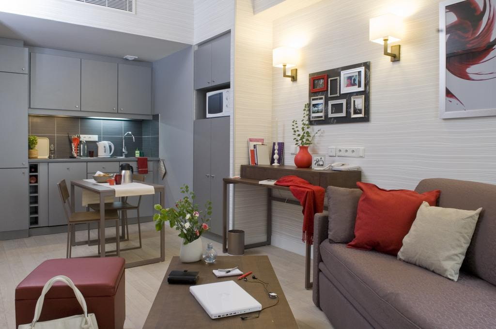 Если рабочая зона оборудована компактно, то для обладателей однокомнатной квартиры оптимальным решением будет организация гостиной в кухне. Разместив диван и телевизор, вы создадите дополнительную зону отдыха, где можно принимать гостей.