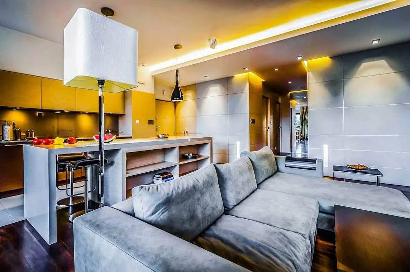 Дизайн кухни-гостиной в его современном виде сложно представить без применения оригинального и качественного освещения