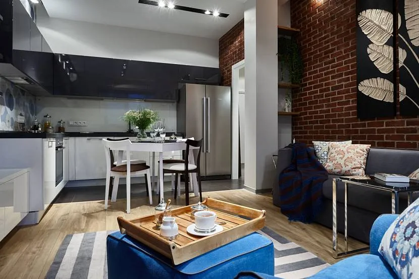 В дизайне квартиры использованы элементы стиля лофт: кирпичная кладка, деревянный пол и серый цвет. Стоит отметить, что за счет отделочных материалов (рельефной кладки и насыщенного цвета дерева с ярко выраженным натуральным узором) удалось создать интерьер, который нуждается в минимальном декоре. В данном случае – это изображение на стене и несколько ярких акцентов.