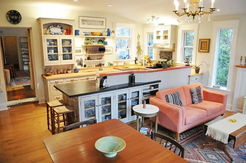 - Декоративные шторы и ширмы, заслоняющие кухню от чужих глаз, но легко отодвигаемые в сторону.
