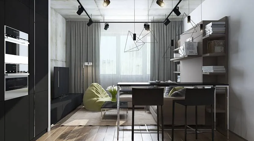 - Часто в оформлении интерьера используют стиль лофт, как на фото. Он подразумевает минимум перегородок, техники, аксессуаров. Модули разделяют освещением или цветовыми акцентами, барной стойкой. Стены не отделывают, трубы остаются неприкрытыми.