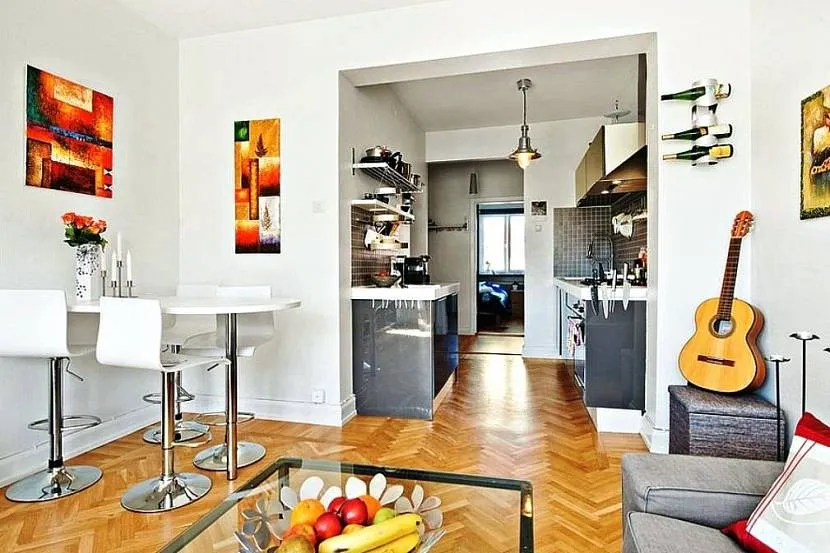 Роль перегородки в интерьере между кухней и гостиной в 30 кв м могут выполнять раздвижные стеклянные двери. Этот вариант удобен еще тем, что запахи и испарение во время приготовления пищи не проникнут в гостиную. Разделяют части помещения и раздвижными ширмами или занавесками из ткани. Перегородки из гипсокартона могут совмещать и другие функции, например, стать опорой для телепанели, содержать встроенный аквариум или проемы для цветов, книг, различных вещей.