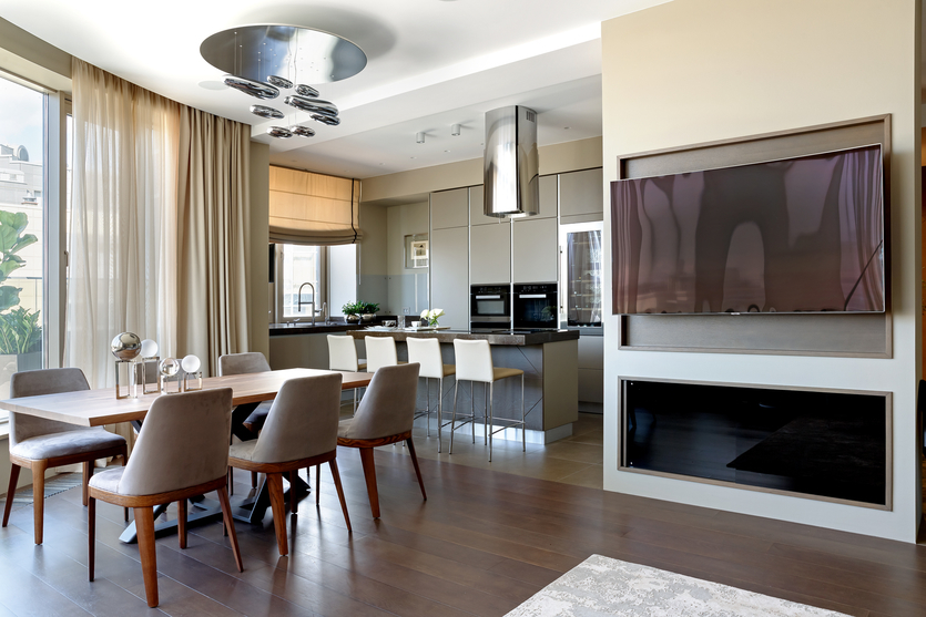 Для квартиры идеальным вариантом является электрическая модель камина, который можно установить в кухне или зоне разграничения с гостиной. Преимущества таких очагов – это экологичность, безопасность и удобство использования. Электрокамин может хорошо обогревать помещение, а для его установки не требуется дымоход и специальное разрешение.