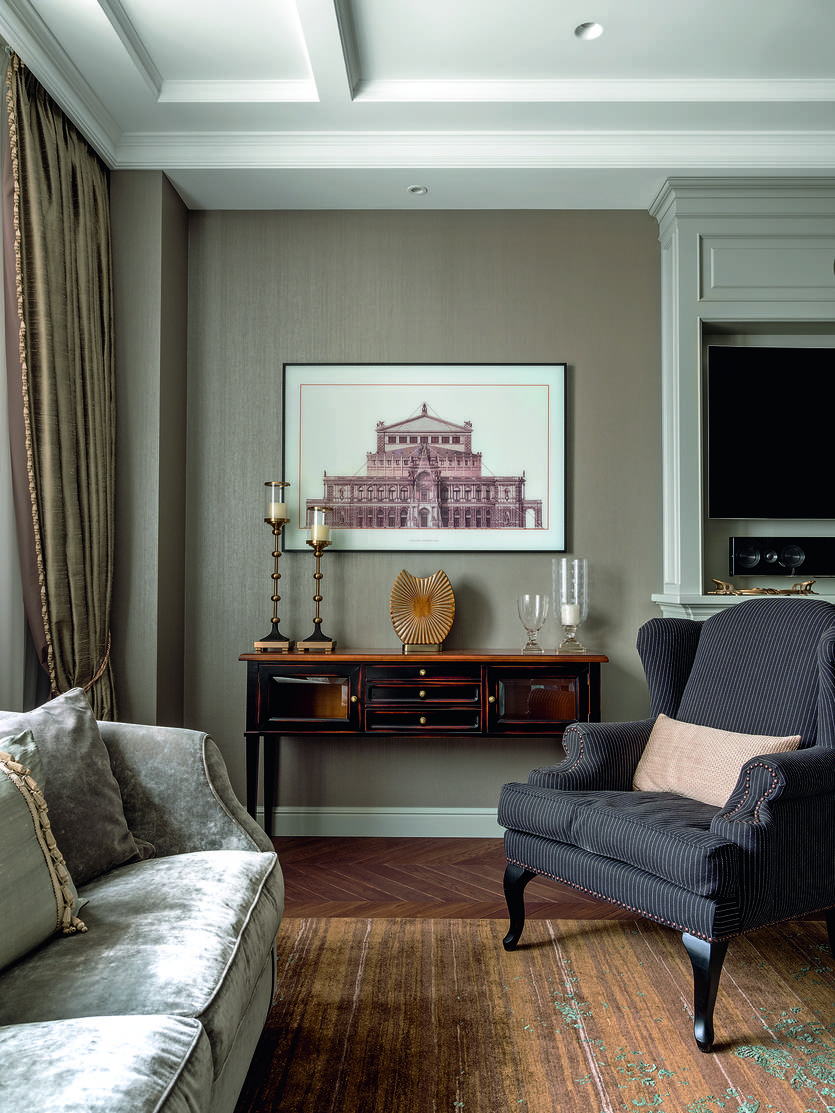 Кинозона и лаунж-зона могут быть и совершенно разными частями гостиной. Такой ход особенно уместен в довольно больших помещениях — и удобен для больших семей. К такому решению также можно обратиться в ситуациях, когда дома часто собираются крупные компании.