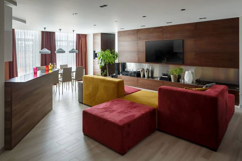 Гостиная вторая по важности зона в совмещённой комнате или студии. Площадь в 30 кв. метров позволяет не ограничиваться в дизайне интерьера, подбирая любые стили