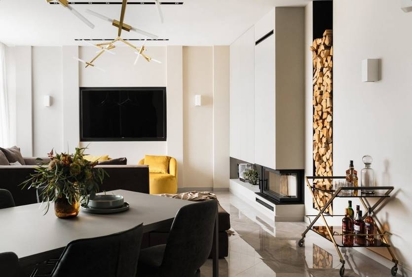 Если помещение кухни-гостиной очень большое, то и камин стоит выбрать достаточно массивный. Причем большого размера может быть не обязательно сам камин, а подиум под ним или поленница. Большой запас свежих дров будет лучшим ароматизатором.