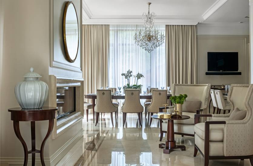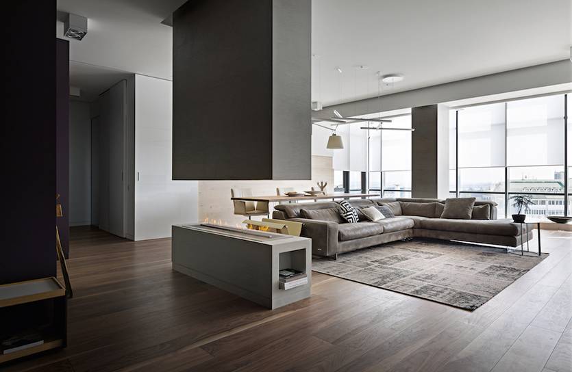 Кстати, двусторонние камины тоже бывают разными. Прозрачными могут быть не только параллельные, но и две перпендикулярные стенки. Это удобно, когда в зоне гостиной стоит и большой диван, и несколько кресел.