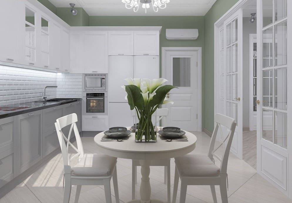 Красивая, стильная неоклассическая кухня в серо-зеленом цвете