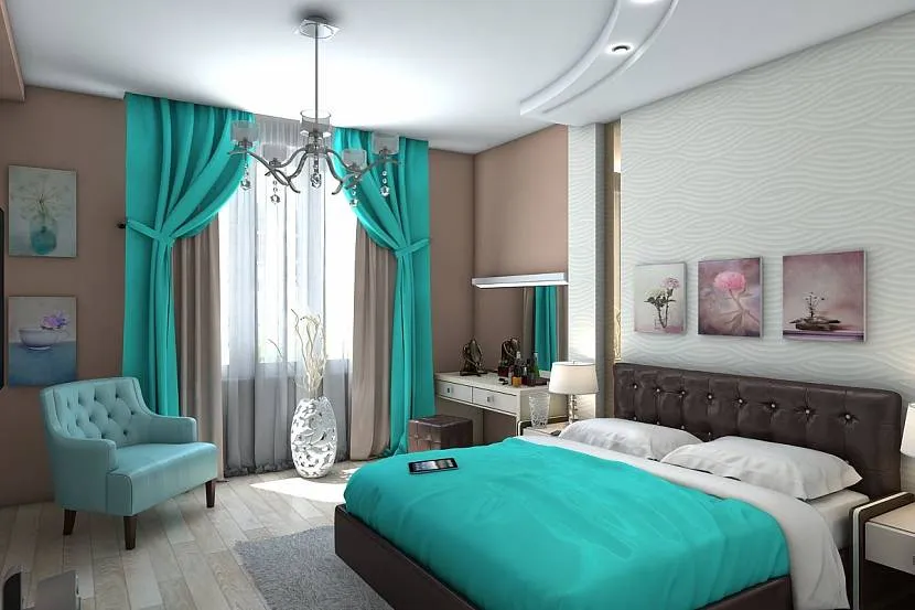 Насыщенный мятный в интерьере спальни