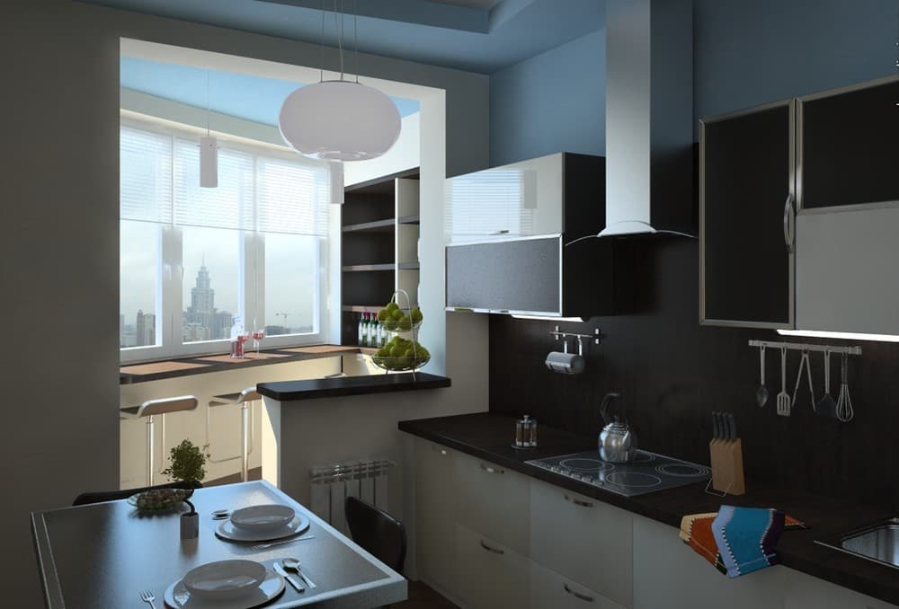 При согласовании перепланировки чаще разрешается демонтировать дверь на балкон, окно и простенок под ним. Оставшуюся арку усиливают металлическим каркасом. Простенок можно не разбирать, а использовать его как основание для столешницы разделочного стола или барную стойку. Стены балкона обязательно утепляют и отделывают тем же материалом, что и кухню, если дизайн не предусматривает иную обшивку. На полу укладывают линолеум, керамическую плитку, паркет или дерево.