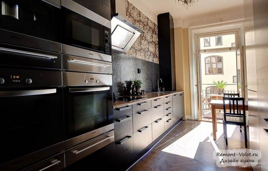 Узкая и длинная кухня? Много техники. Рабочая зона оформлена в оттенках горького шоколада. В качестве выхода на балкон, большая застекленную дверь в пол с распашными створками. Темный массивный кухонный гарнитур нуждается в дополнительном освещении, в противном случае он будет выглядеть чрезмерно громоздко.