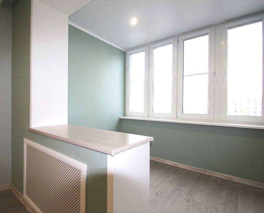 Чтобы визуально увеличить оставшееся пространство, его выполняют в светлых тонах. Когда невозможно демонтировать подоконник на балконе, он оформляется как обеденный или рабочий стол. В таком помещении часто укладывают теплый пол, потому что как бы хорошо не была утеплена лоджия, долго находиться там зимой может быть прохладно. Также это целесообразно для семей с маленькими детьми.