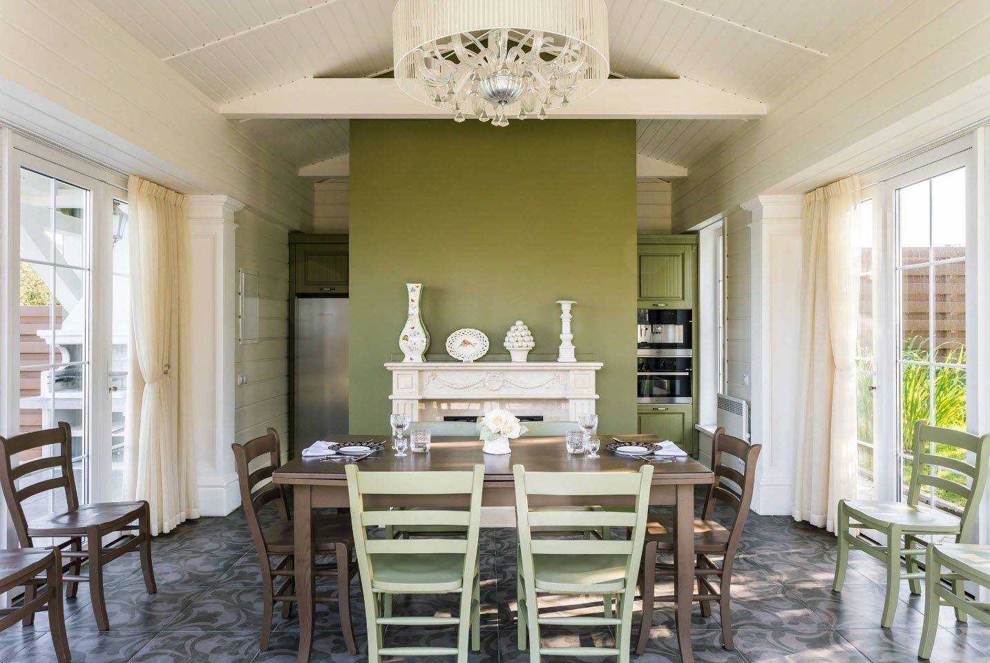 Обустройство кухни на даче не заканчивается установкой гарнитура. Необходимо найти место для обеденного стола или барной стойки. Если у вас кухня гостиная на даче, можно организовать столовую зону с диваном на расстоянии от рабочей. Либо установите длинный прямоугольный полуостров между двумя пространствами для зонирования — его используют как стол и рабочую столешницу.