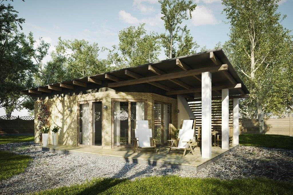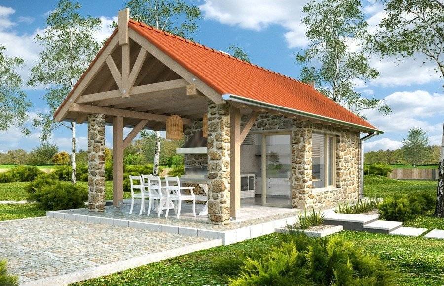 Этот проект еще более функциональный, чем предыдущий. В дополнение к просторной кухне внутри здания, где запланировано место для приготовления пищи и еды, есть также туалетная комната и зона для отдыха. В таком спроектированном объекте вы можете провести целый день, не возвращаясь домой. На кухне архитектор запланировал место для выпечки, жарки и коптильни. На просторной террасе вы можете организовать мини-гостиную со столовой. Сам проект довольно прост, поэтому его реализация также не потребует больших финансовых затрат.
