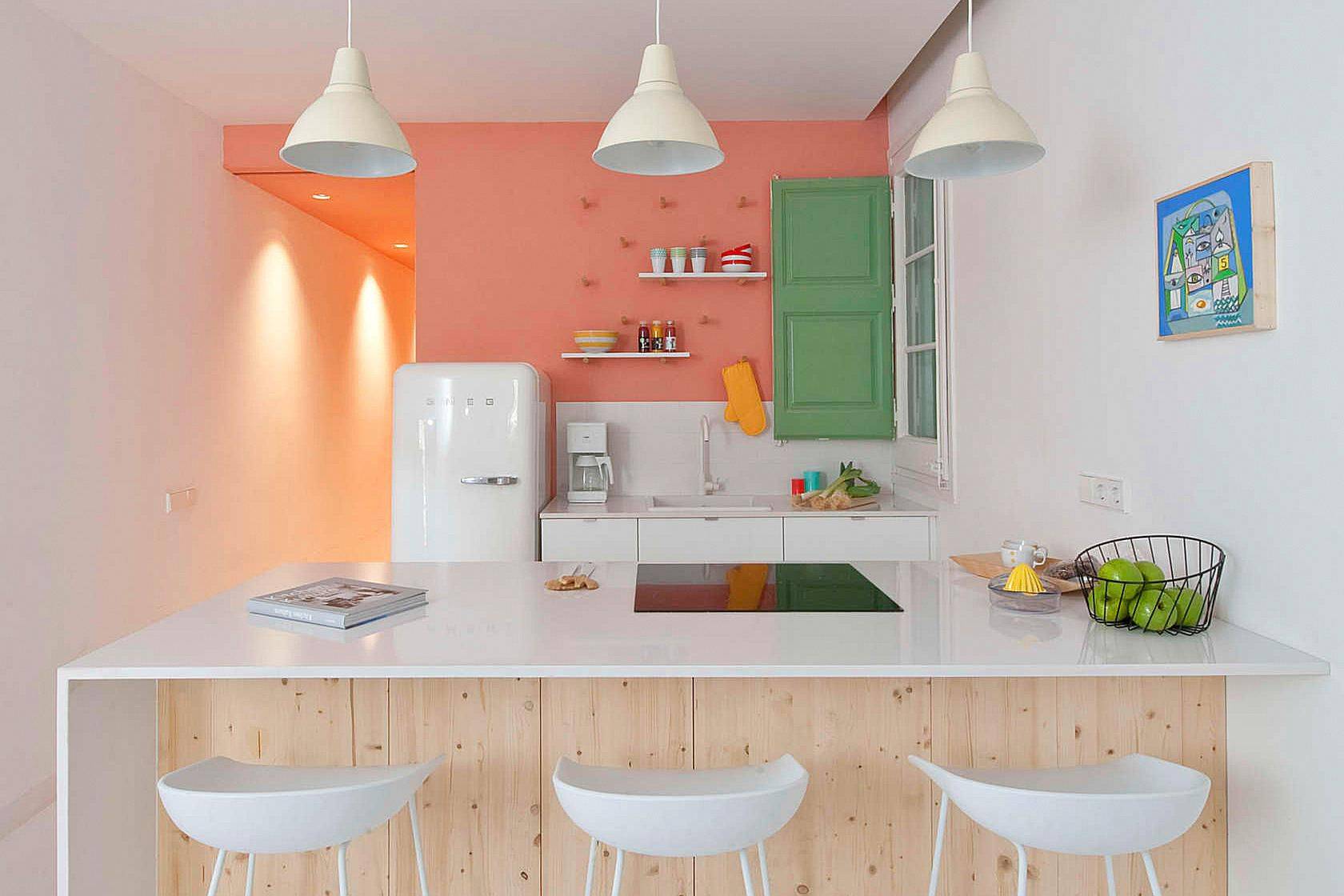 Использование пастельного персикового оттенка на маленькой кухне
