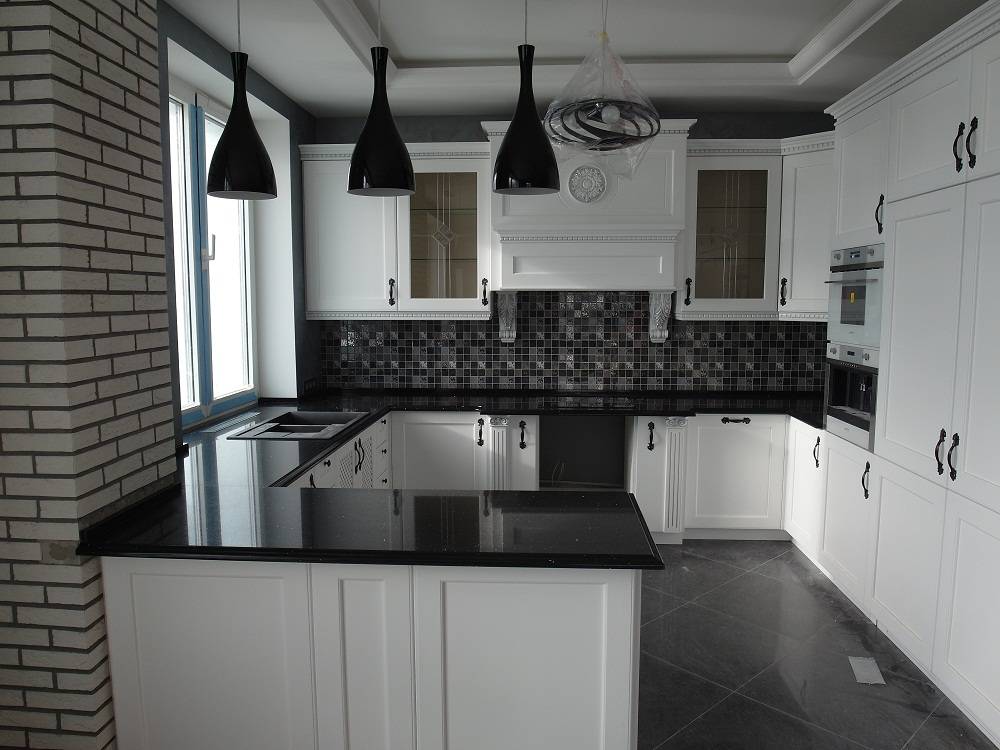 Рекомендуем установить угловой гарнитур, который чаще всего занимает немного места и вмещает в себя множество необходимых функций. Также такой выбор оставляет Вам место для обеденного стола.
