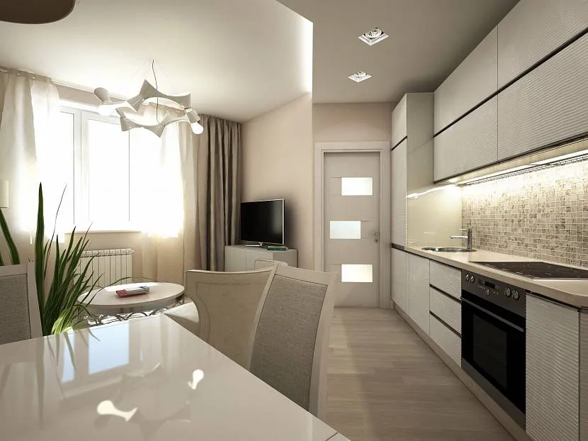 Такую планировку предпочитают владельцы вытянутых в длину помещений. В этом случае недостаток оборачивается достоинством, поскольку расположение каждого элемента можно спланировать с исключительной точностью по своему желанию. Например, установить рядом мойку и плиту.