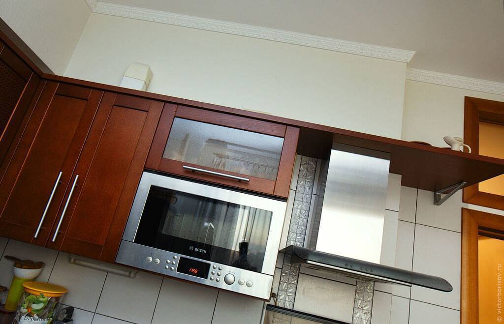 При высоте потолков на кухне от 230 до 250 см, от верхней части навесного шкафа до потолочной поверхности остается 30–50 см. Довольно много хозяек используют полученные открытые полки именно для хранения редко используемых вещей. Увы, такое решение удачным назвать нельзя: во-первых, на открытых полках скапливается масса пыли и грязи; во-вторых, все предметы, на них находящиеся, подвергается нагреву, охлаждению и действию пара так же, как, собственно, мебель и материал отделки.