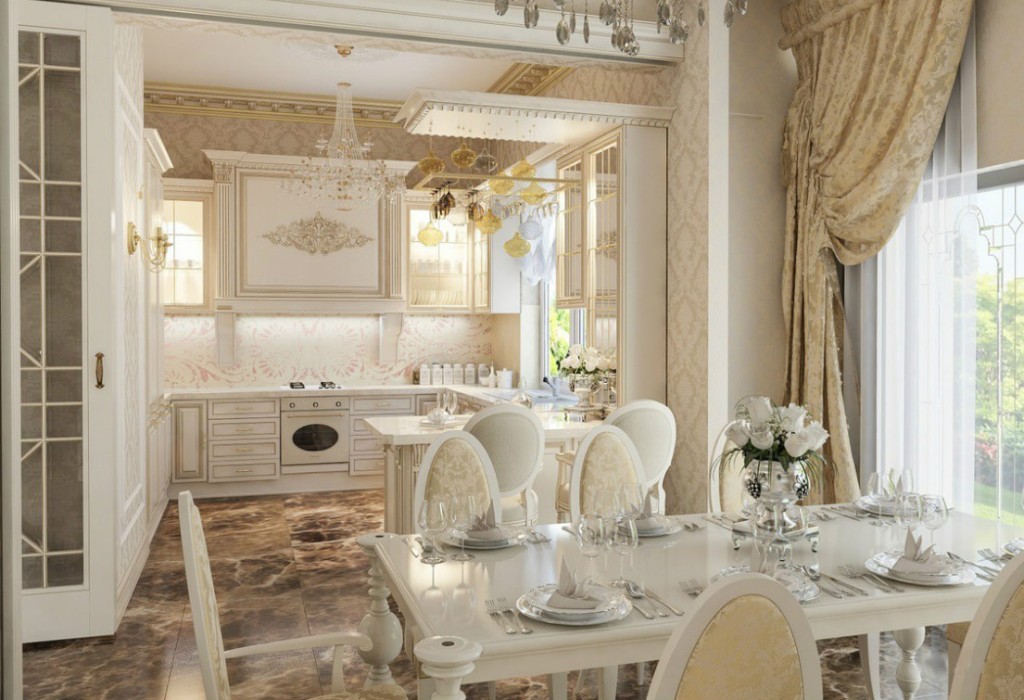 Традиционная классика характеризуется красотой, изысканностью, строгостью вкуса, сдержанным шиком. Так как в классике актуальны пастельные, светлые тона, такой дизайн подходит для нашего метража. Отделку выполняют светлой палитрой из коричневого, бежевого, нежного желтого, избегая насыщенности и ядовитых оттенков. На стенах нужен растительный узор, клетка, полоска. Обстановка обычно имеет позолоченную окантовку или эффект искусственного состаривания. Гарнитур симметричный, со строгой геометрией.