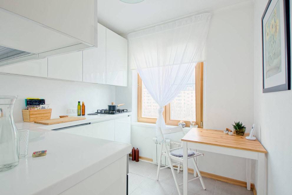 Мебель на такой кухне должна быть максимально эргономичной и продуманной, лучше всего поставить тут небольшой угловой шкаф, также можно использовать складную мебель (стол-трансформер, быстро раскладываемые стулья).