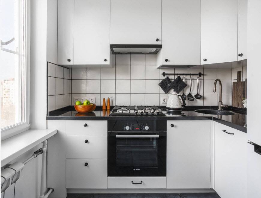 Для маленькой кухни подходит еще и угловая планировка, когда гарнитур устанавливается в виде буквы Г. Это позволяет максимально задействовать один из углов.
